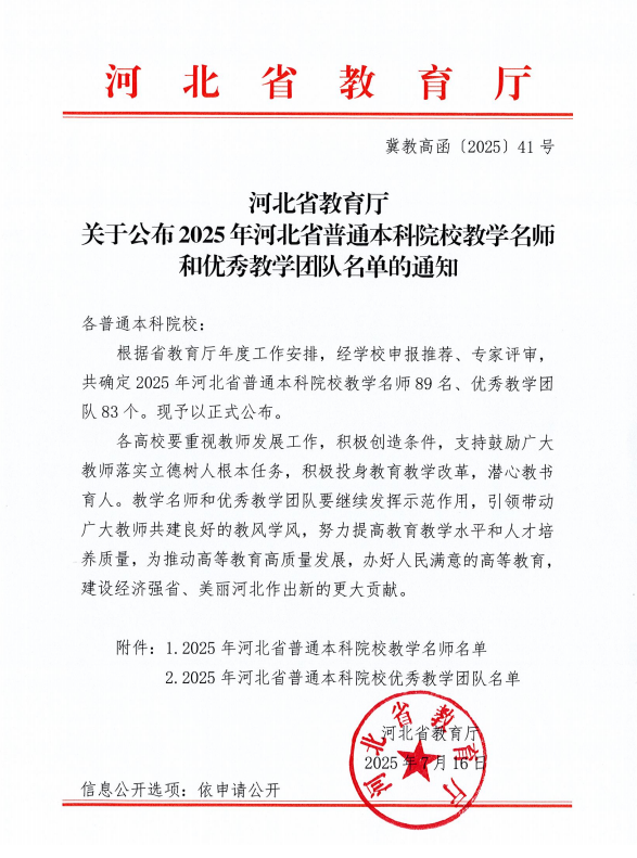 近日,河北省教育厅公布了《关于公布2025年河北省普通本科院校教学名师和优秀教学团队名单的通知》(冀教高函〔2025〕41号)。beat365外国语学院院长王娜教授获评“河北省普通本科院校教学名师”,经济管理学院院长李建忠教授负责的财务管理专业主干课程教学团队获评“河北省普通本科院校优秀教学团队”。
