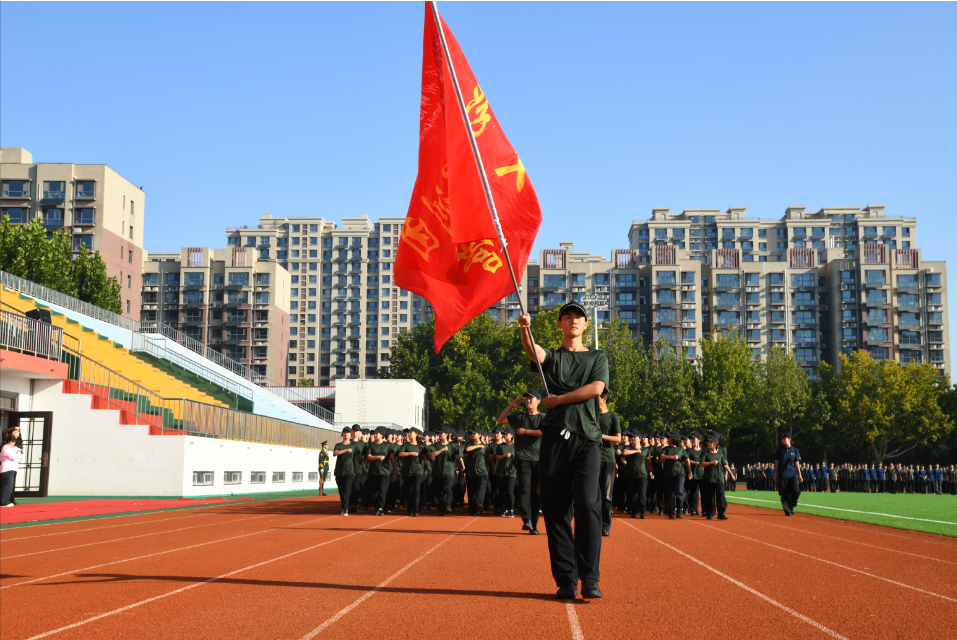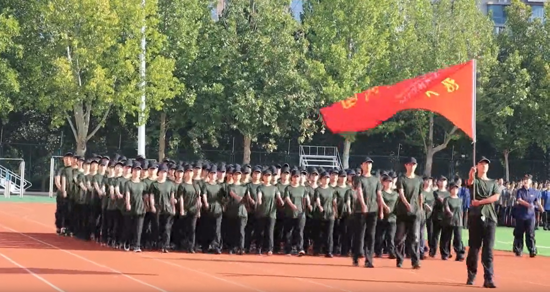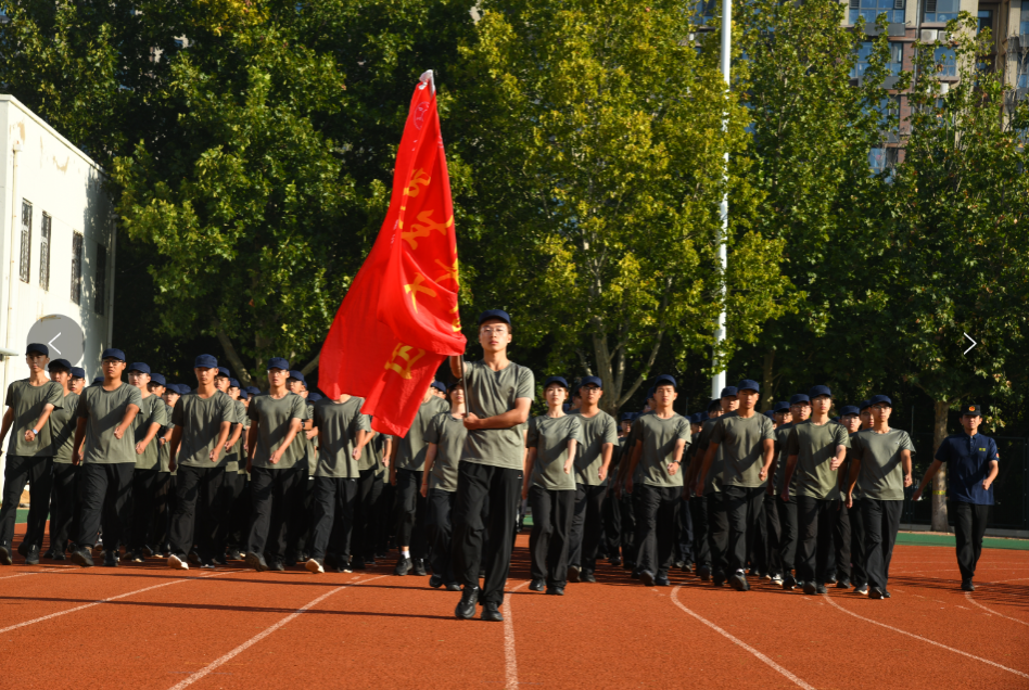 听 口号洪亮撼天动地 看 步履坚定积极向前 整齐划一的动作 昂首阔步的姿态 踏出的是步步脚印 迈出的是坚定信念 军训团团旗
