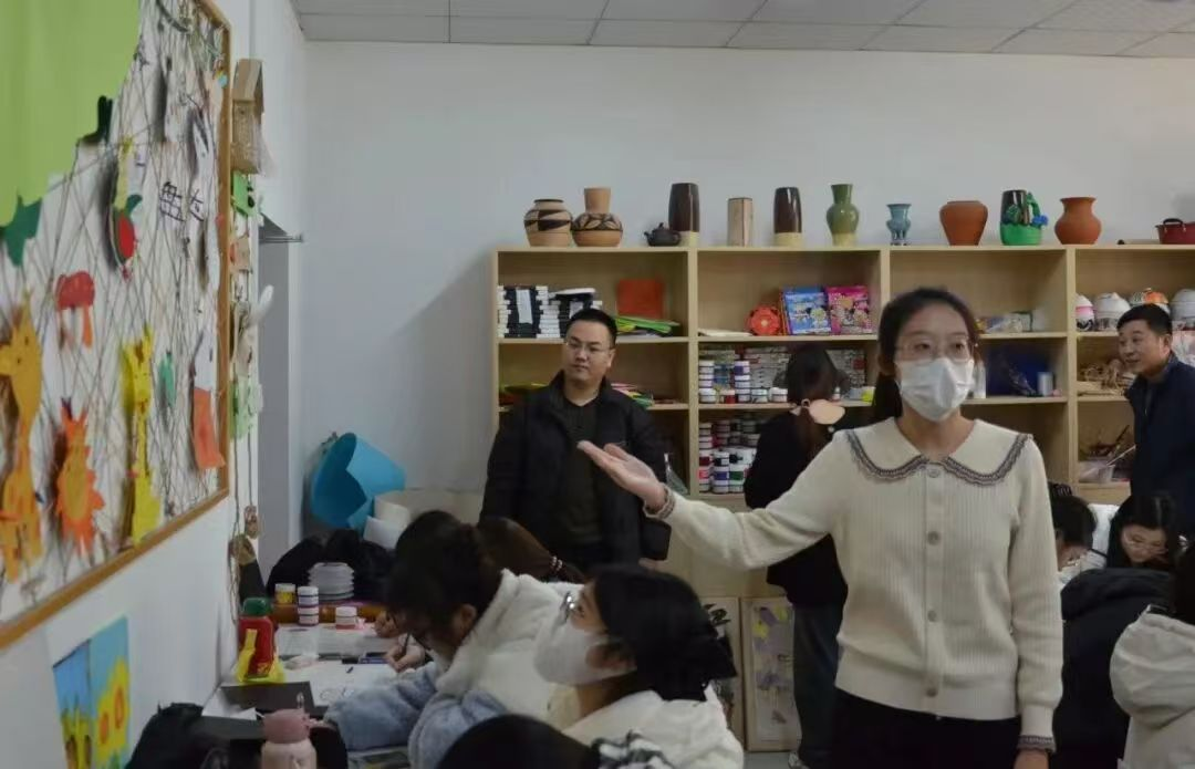 学生在婴幼儿美术启蒙实训室进行美术作品讲解