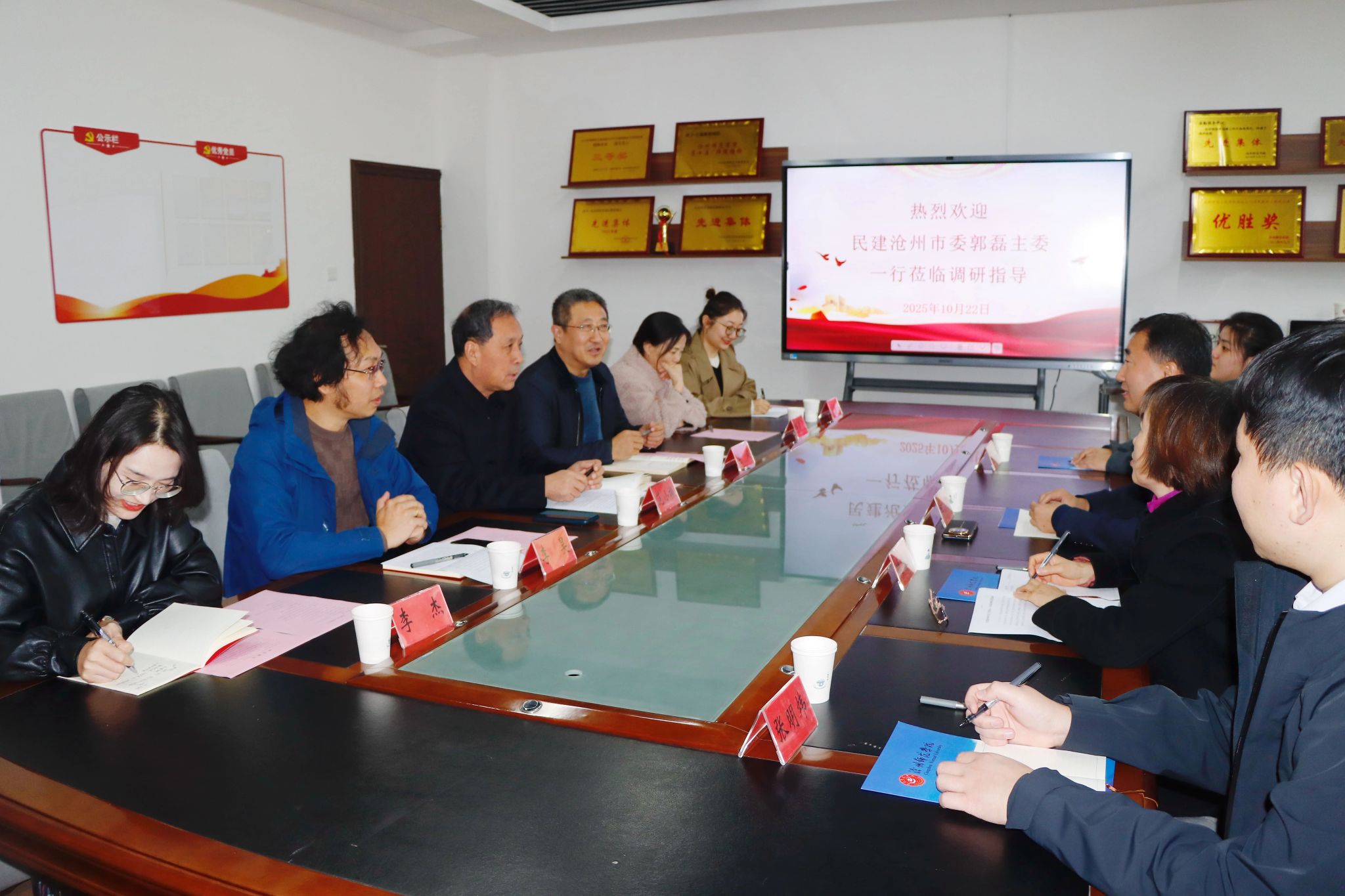 10月22日,民建沧州市委主委郭磊一行来beat365就民建会员工作、履职情况和思想态势进行调研并座谈。党委副书记范小振,民建沧州市委主委郭磊、副主委魏富春、办公室四级主任科员张明炜、吴雪纯,beat365宣传部部长李健、现代教育技术中心主任李昊、宣传部科长李杰、经济管理学院教师邸晨霞、鲍梦蕊参加座谈会。
