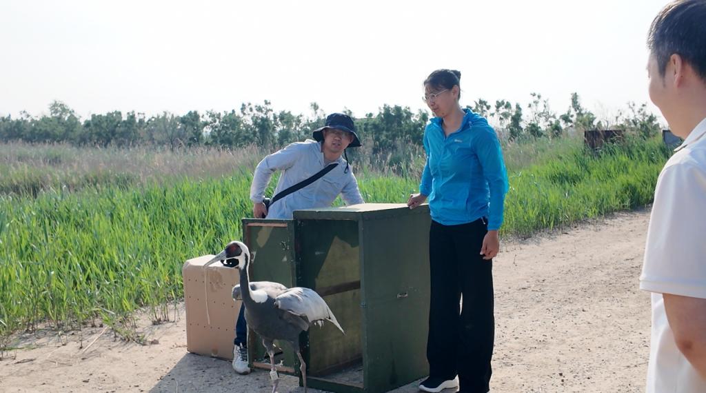 据介绍,白枕鹤又叫红脸鹤、红面鹤,属大型涉禽,略小于丹顶鹤,主要栖息于开阔的平原芦苇沼泽和水草沼泽地带。目前,白枕鹤数量稀少,在全球范围内种群仅存不足万只,世界自然保护联盟将其评估为极危物种,在我国被列为国家一级重点保护野生动物,被誉为“国宝级”珍禽。