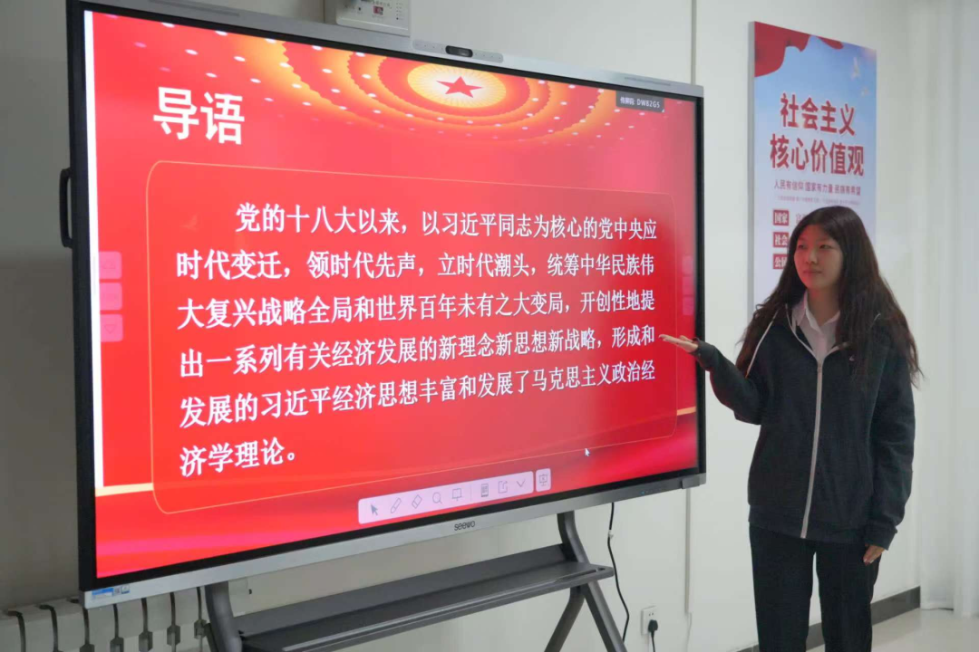 马克思主义学院22级学生刘香池从体系、特征与意义三方面深入阐释了习近平经济思想,在讲解中,同学们认识到了习近平经济思想意义的深远。它深刻回答了新时代经济发展的重大理论和实践问题,是习近平新时代中国特色社会主义思想的重要组成部分,是党的宝贵思想结晶,更是我国经济高质量发展和全面建设社会主义现代化国家的科学指南。