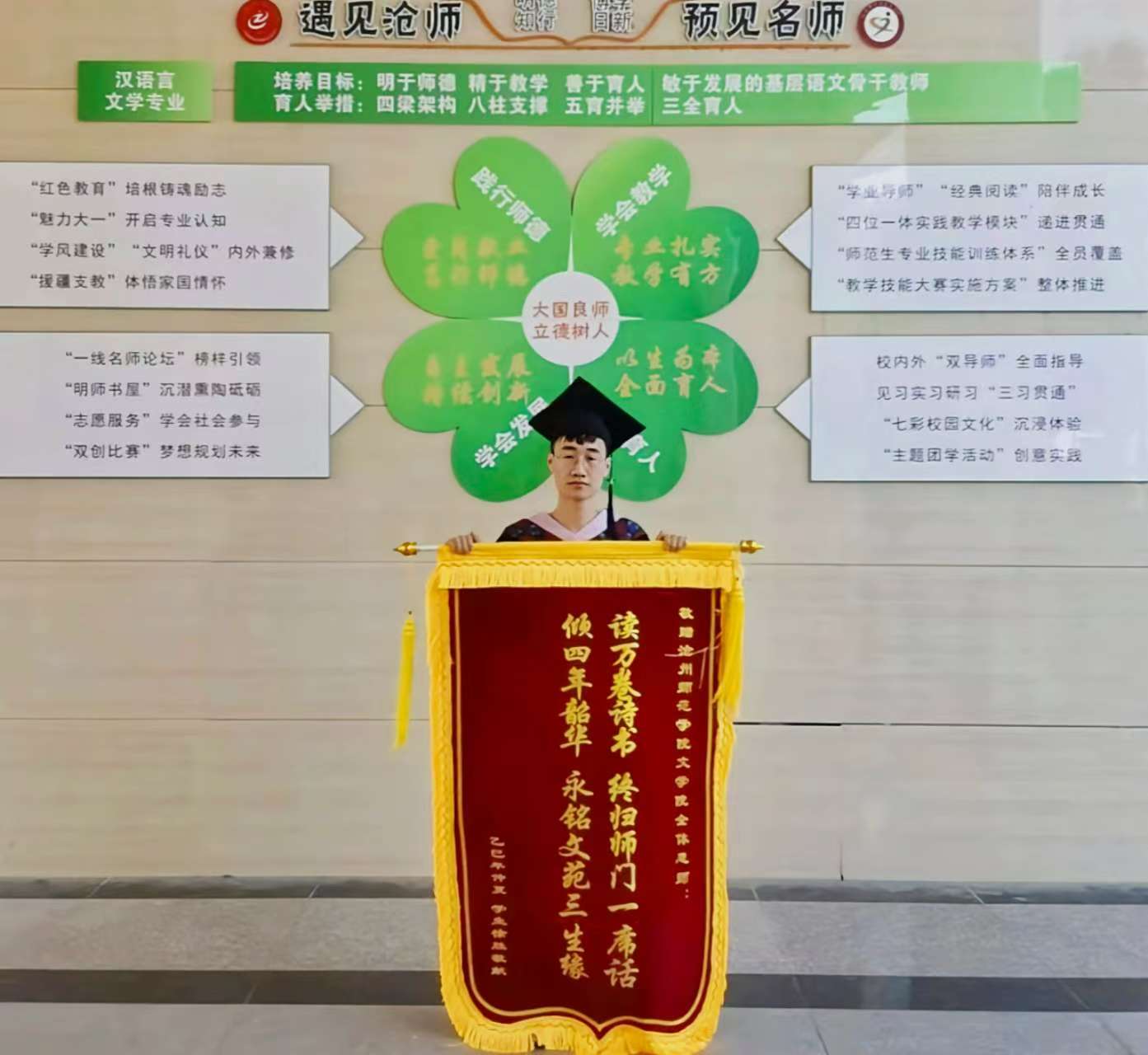 近日,2025届毕业生徐胜代表同窗,将一面题有 “读万卷诗书,终归师门一席话;倾四年韶华,永铭文苑三生缘” 的锦旗赠予文学院全体恩师。