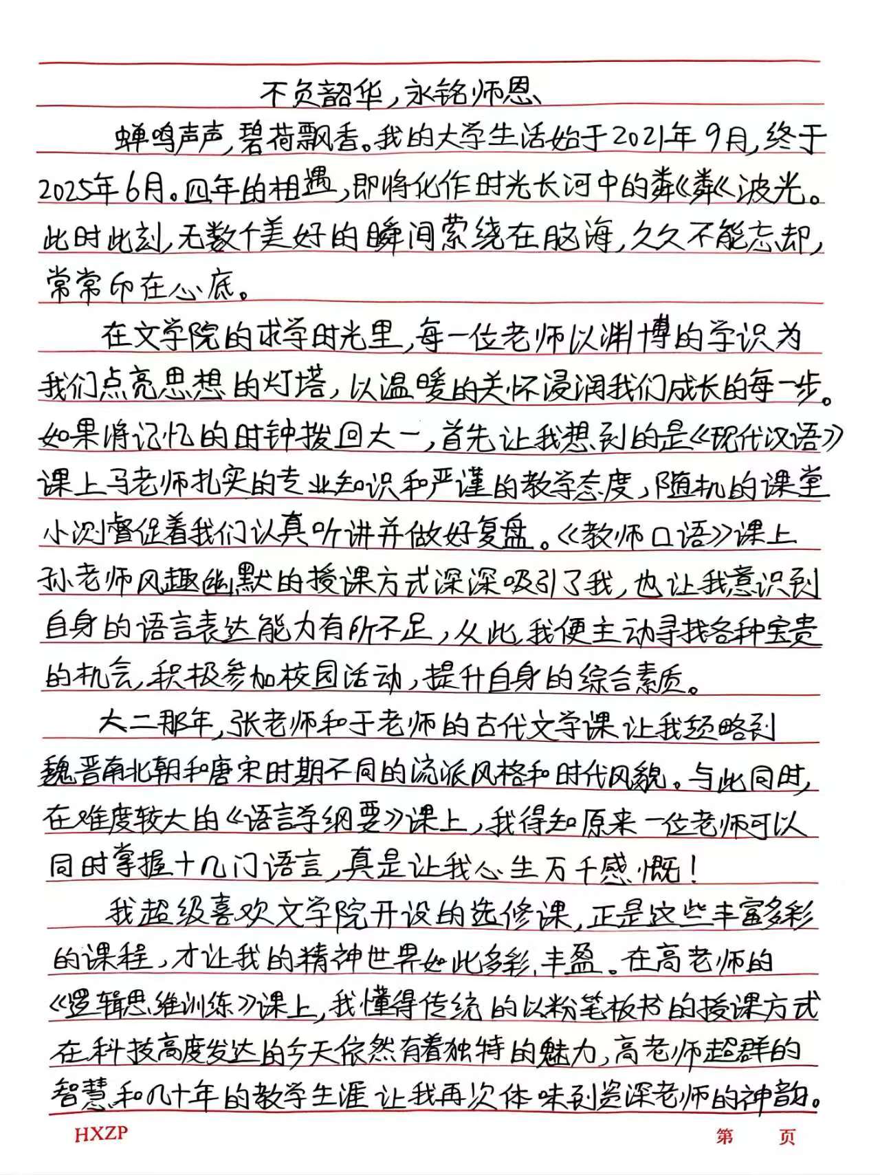 这面锦旗,是学子们对老师智慧引领的由衷致谢,也是对文学院四年时光的深情回望。随锦旗附上的亲笔信笺,更流淌出对恩师春风化雨、传道受业的肺腑感怀。