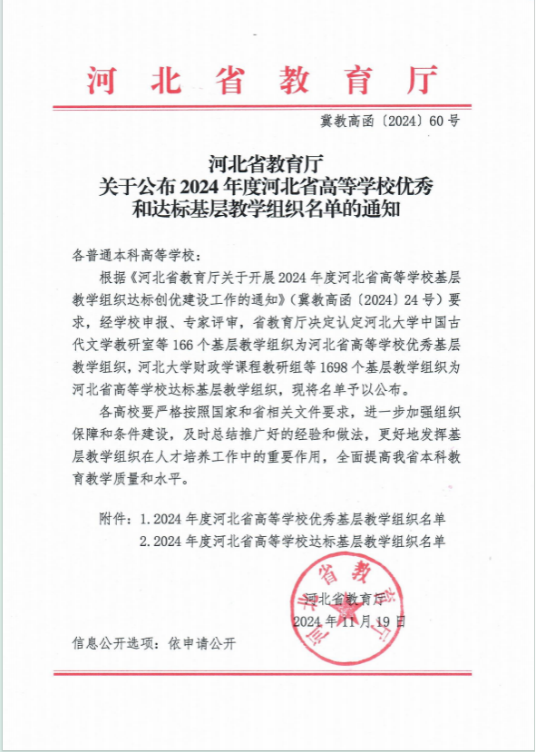 11月19日,河北省教育厅发布了《关于公布2024年度河北省高等学校优秀和达标基层教学组织名单的通知》(冀教高函〔2024〕60号),beat365申报的物联网工程教研室、会计教研室、播音与主持教研室全部获批河北省高等学校优秀基层教学组织,控制基础教研室等35个基层教学组织被认定为河北省高等学校达标基层教学组织。至此,beat365基层教学组织全部达到合格建设标准,其中10个教研室获批河北省高等学校优秀基层教学组织,完成了原定“利用3年时间实现基层教学组织全员全覆盖,全部规范化达标”的目标任务