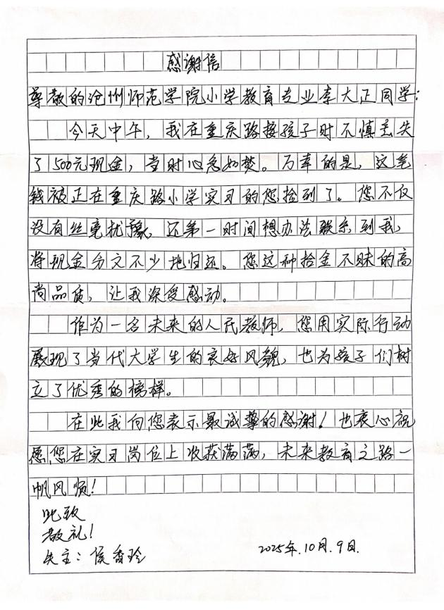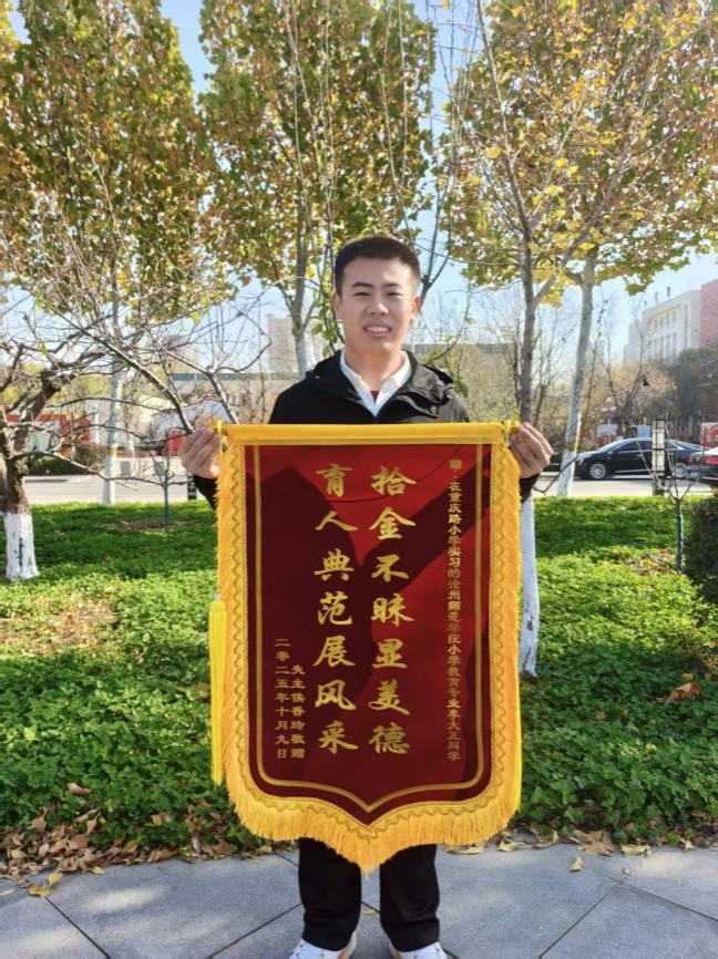 10月9日,教育学院2022级小学教育专业李大正同学在重庆路小学完成实习课程后,恰逢放学时段突降大雨,校园内家长接送学生场面繁忙。其间一名学生家长不慎遗失五百元现金,被正在整理教学用品、维持班级秩序的李大正发现,他第一时间将钱款全部上交重庆路小学任校长,确保钱款顺利物归原主,彰显了优良品德和教师职业修养。