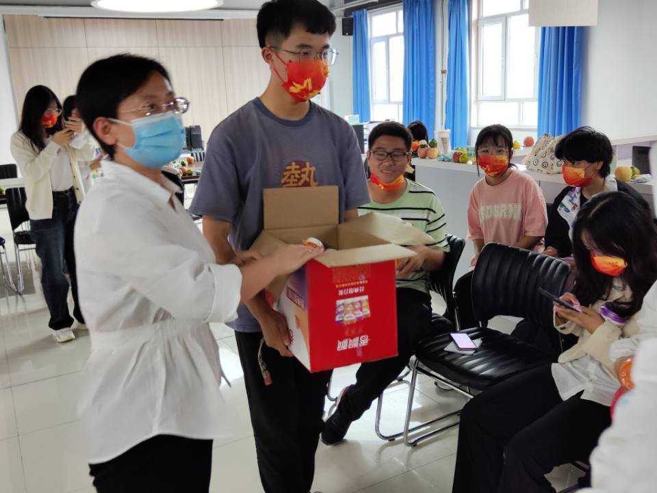 陈瑞坤一边发放国庆礼物,一边勉励同学们坚定理想信念,树牢强技报国之志,锤炼过硬本领,为祖国建设积极贡献自己的青春力量。