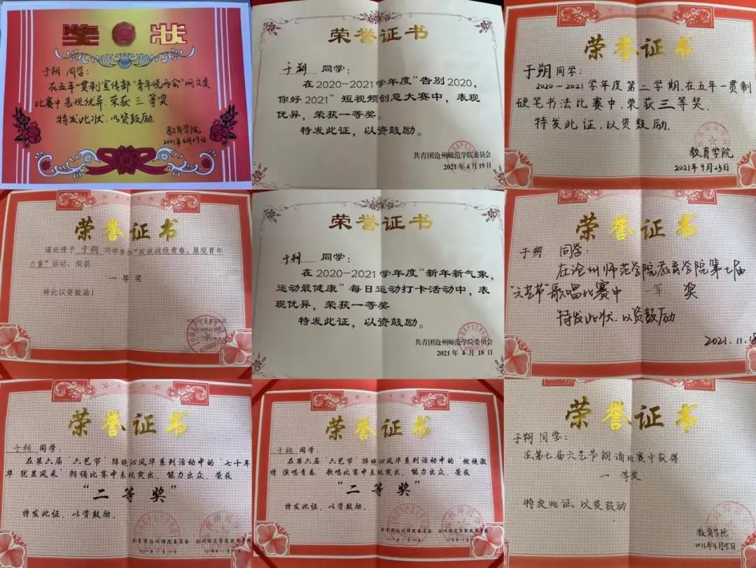于朔深知社会实践是接触社会、提高能力的重要途径,在校期间,他将专业能力与创新和实践相结合。2021年6月,与同学合作“追寻红色足迹 永筑红军精神”创新创业项目荣获“挑战杯”河北省大学生课外学术科技作品竞赛红色专项活动二等奖;暑假期间,参加了校“青春伴我行·你我共成长”大学生社会实践专项活动,通过线上方式面向乡村小学生开展对口辅导帮扶。此外,朗诵、演讲、唱歌、剪短视频……他也样样在行,先后获得学校“再见2020,你好2021”短视频创意大赛荣获一等奖,在第七届六艺节“朗诵比赛”及“歌唱比赛”中均获一等奖。