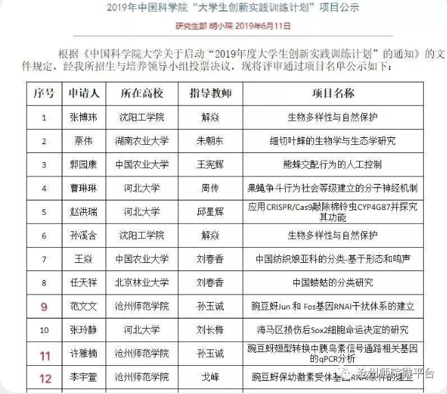 2019年6月19日,从中国科学院传来喜讯:我院生命科学特色实验班的三个学生科研团队成功申报获得“中国科学院大学生创新实践训练计划”项目资金。三个学生科研团队分别是:范文文、任一恒、武陶陶同学的“豌豆蚜jun和fos基因RNAi干扰体系的建立”项目;李宇萱、杜文婷、吴星同学的“豌豆蚜翅型转换中胰岛素信号通路相关基因的qPCR分析”项目;许雅楠、马雪娇、葛红敏同学的“豌豆蚜保幼激素受体基因RNAi条件的建立”项目。三个团队每组获得项目资金1万元。