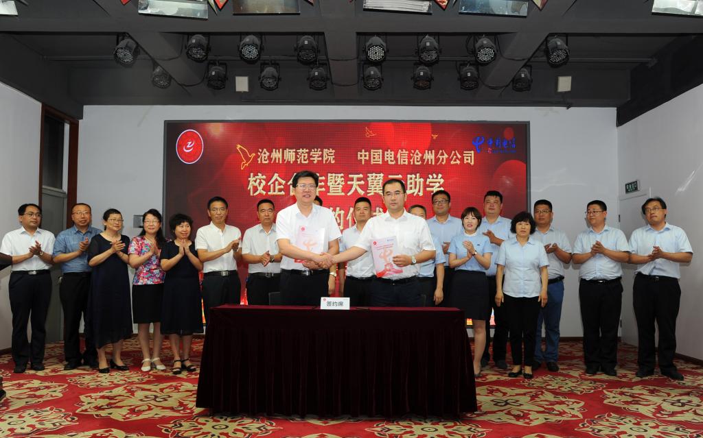 6月19日,beat365与中国电信沧州分公司第二期校企合作暨天翼云助学签约仪式在中国电信沧州分公司会议室举行。党委书记云电军,党委常委、副校长彭学君,中国电信沧州分公司党委书记、总经理李学庆,副总经理刘永兴、张路朝出席签约仪式。