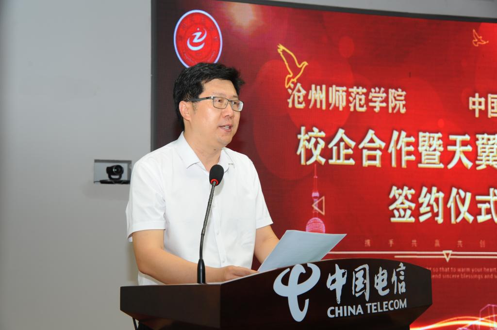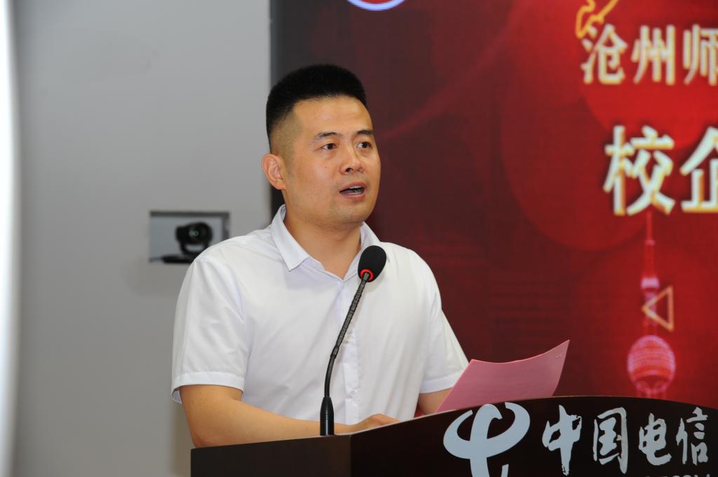 李学庆介绍了近年来中国电信沧州分公司的发展概况,特别是在校园基础网络、智慧校园、平安校园建设、区域教育平台构建,以及校园精准教学大数据中心建设等方面的成果。就校企合作问题,李学庆表示,校企合作不仅能够为学校提供优良的科研平台,提高学校的综合实力和竞争能力,也有助于企业践行社会责任,增强企业活力。中国电信沧州分公司将以为学生提供实训实习基地,天翼云助学为切入点,积极探讨校企合作新路径。