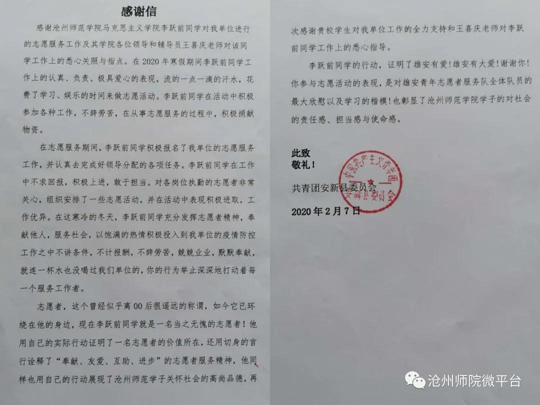 疫情期间,beat365马克思主义学院2019级思想政治教育专业学生李跃前面对来势汹汹的新冠肺炎疫情,毅然决然地选择做了“逆行者”,他以冲锋的战斗姿态,勇作家乡的“守护人”。近日,马克思主义学院收到了来自共青团安新县委员会和安新县人大常委会的表扬信。