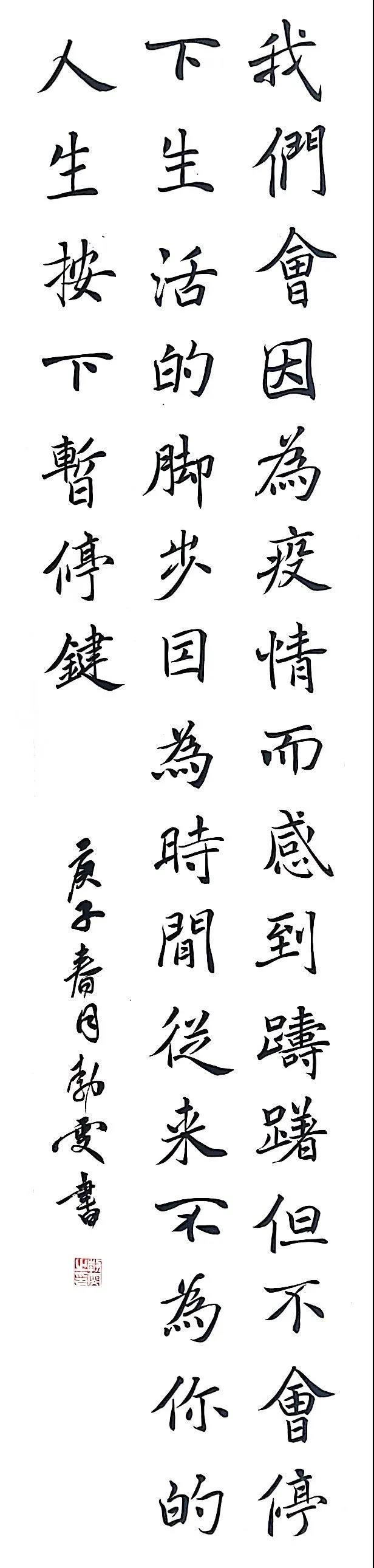 作品释文: 我们会因为疫情而感到踌躇,但不会停下生活的脚步,因为时间从来不为你的人生按下暂停键。