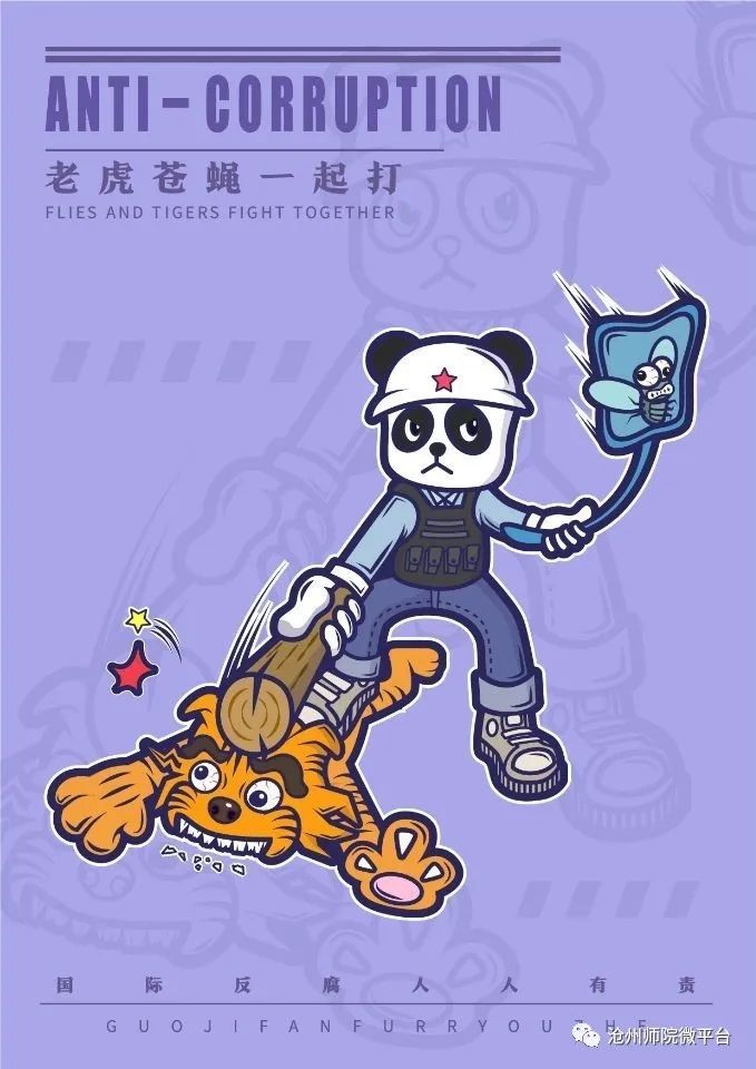 主指导老师郝小梅评价道:“杨莹杰同学专业成绩优秀,专业能力较强。整个作品的立意主要围绕着‘老虎苍蝇一起打’这句话,通过AI软件进行插画设计。作品形式直观,寓意明确,借用中国代表性的国宝熊猫化身为警察形象打击腐败的‘老虎苍蝇’,表明了国家反腐的范围之广、力度之大。”
