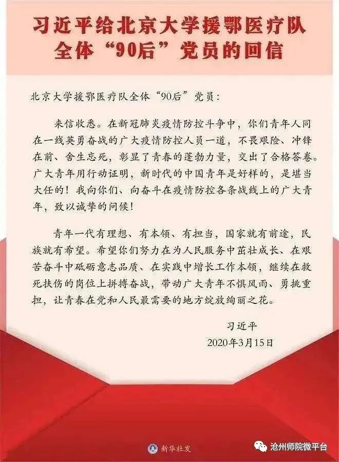 3月15日,中共中央总书记、国家主席、中央军委主席习近平给北京大学援鄂医疗队全体“90后”党员回信,向他们和奋斗在疫情防控各条战线上的广大青年致以诚挚的问候。