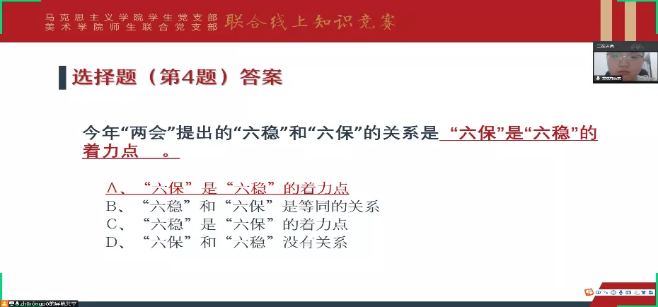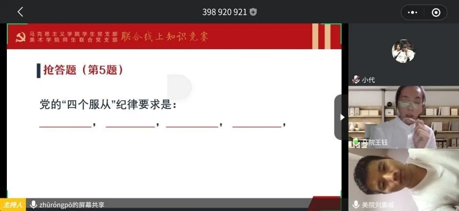 马克思主义学院师生联合党支部书记王喜庆、马克思主义学院党员教师王刚、美术学院师生联合党支部书记曾凡超、美术学院师生联合党支部组织委员孙静怡共同观看了本次比赛,参赛者为两支部的党员及入党积极分子共十名同学,另有大量学生观众观看了此次活动,参与热情之高充分彰显了新时代青年对党认知的积极性和新高度。本次竞赛分为选择题、必答题、抢答题三个环节,题型内容涵盖党史知识、党的十九大及十九届二中、三中、四中全会精神、习近平新时代中国特色社会主义思想、beat365在线唯一官网