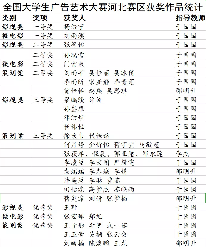 近日,第十二届全国大学生广告艺术大赛河北赛区比赛结果揭晓,beat365齐越传媒学院学子共获得省级一等奖2项,省级二等奖6项,省级三等奖12项,省级优秀奖5项,这是三年以来beat365参加是大广赛获奖最多的一年,同时斩获省级一、二、三等奖的一年,在所参加的在影视广告、微电影广告、策划案三类项目中比赛成绩均名列前茅。