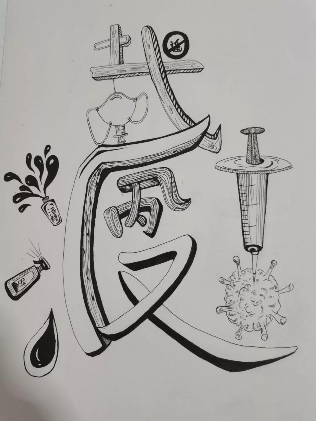我用黑白颜色手绘画出了“战疫”两个字,画面中融入防护用的口罩、消毒液、不传谣不造谣的标志,以及被针头消灭的新冠病毒。疫情当前全国各地团结一心,付出在一线的医护人员和前线的志愿者我向您们致敬,你们是我们的榜样!