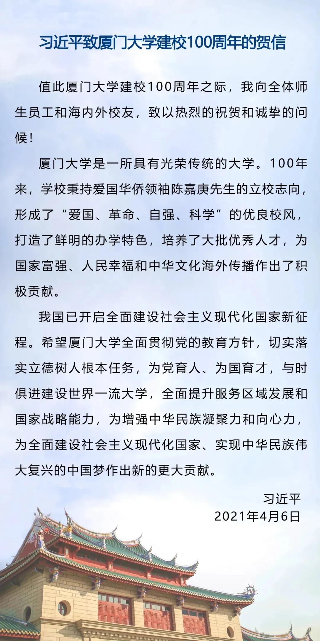 贺信中特别提到了爱国华侨领袖陈嘉庚先生。嘉庚先生一生热心捐资兴学,在实业蒸蒸日上之时,他首先想到的是“教育救国”,以教育开启民智,改变祖国当时贫穷落后的面貌。他一辈子生活简朴,但是在捐资兴学方面不惜一切,把一生获取的财富,悉数用来支持教育事业。此后,他竭尽全力、苦心经营,即便是经济最困难的时候,“宁可变卖大厦,也要支持厦大”,宁愿企业收盘,也绝不停办学校。百年奋进,薪火相传。百年间,从厦门大学走出了无数优秀人才奔赴不同的岗位,以服务国家、服务人民为己任,在全球各地留下奉献社会的足迹,在各行各业书写着报效国家的华美篇章。读了总书记的贺信我倍受鼓舞,同时了解到陈嘉庚先生的捐资办学事迹我深受感动。作为教师,我们一定要潜心教学科研,同时应时刻谨记新时代赋予我们的使命,不断提升自身的教师职业素养,努力践行“孜孜以求,团结奋进,精益求精,敢于胜利”的师院精神,以更加杰出的表现不辱时代使命,用青春谱写太阳下最光辉的职业篇章。