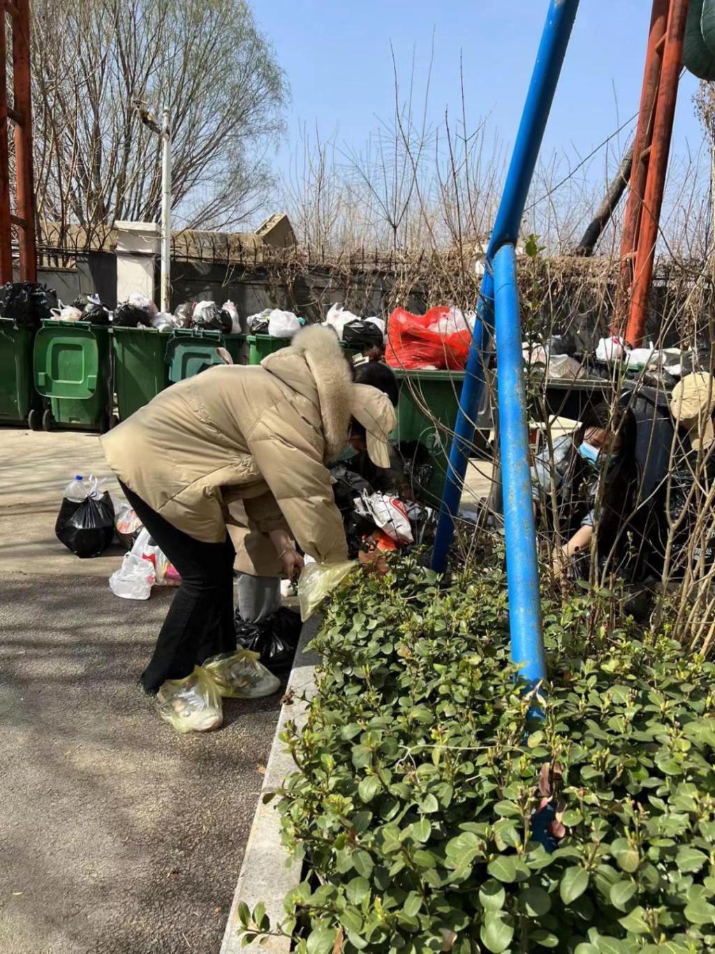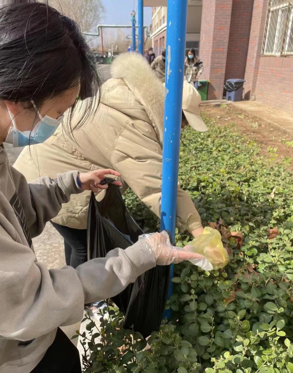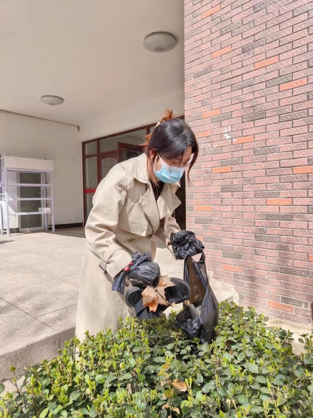 还有部分志愿者在五号楼楼外,帮助beat365保洁人员进行卫生清洁工作,捡拾白色垃圾,将垃圾统一放置,为beat365防疫工作减轻部分压力,奉献自己的一份力量。
