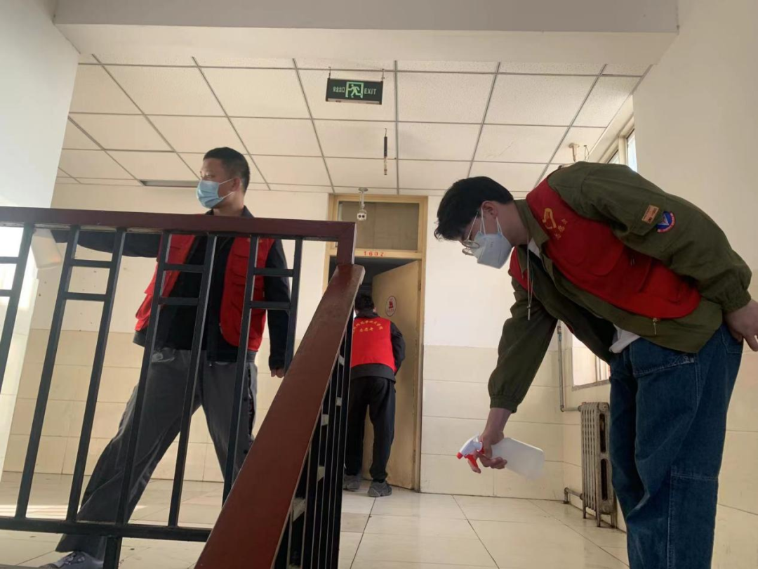 志愿者们严格按照疫情防控消杀标准进行规范消毒。对一号楼全楼楼道、水房以及4、5、6层每个宿舍的床面、床底、门角、阳台等进行多角度、全方位消毒。楼梯扶手、水房水龙头、宿舍门把手等经常接触的地方也不放过,大范围喷洒消毒液进行消杀,确保做到不留死角、不留盲区,筑牢抗疫安全防线。同时消杀过程中,志愿者们也暖心提醒同学们一定多通风,按时清理宿舍垃圾,避免细菌滋生。