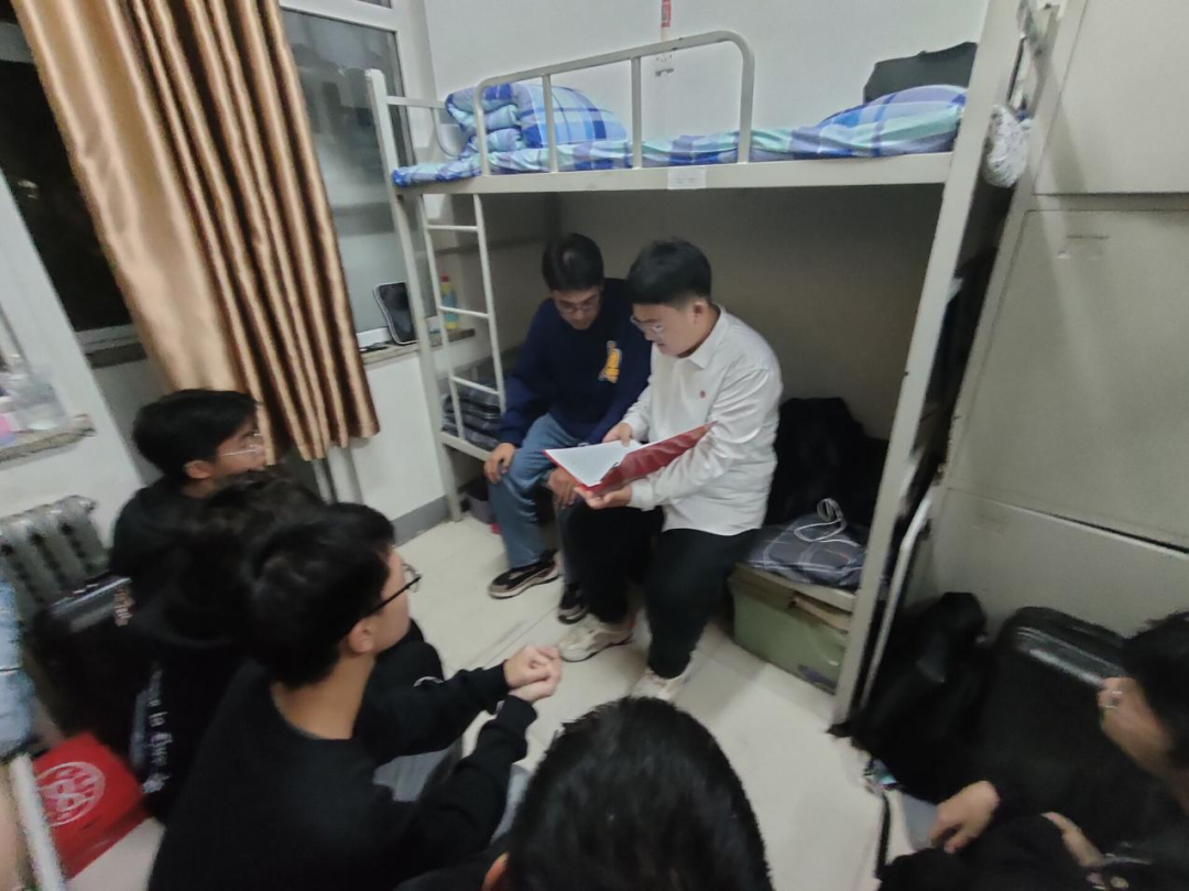 入党积极分子发挥模范带头作用,先学一步、深学一层,在宿舍里,以亲切的语言、生动的故事宣讲党的二十大精神。他们结合自身的成长经历,勉励学弟学妹们、舍友同学们牢记习近平总书记的嘱托,坚定理想信念,树立远大理想,练就过硬本领,践行“请党放心,强国有我”的青春誓言,为民族复兴贡献新时代青年的青春力量。宣讲深受同学们的欢迎。