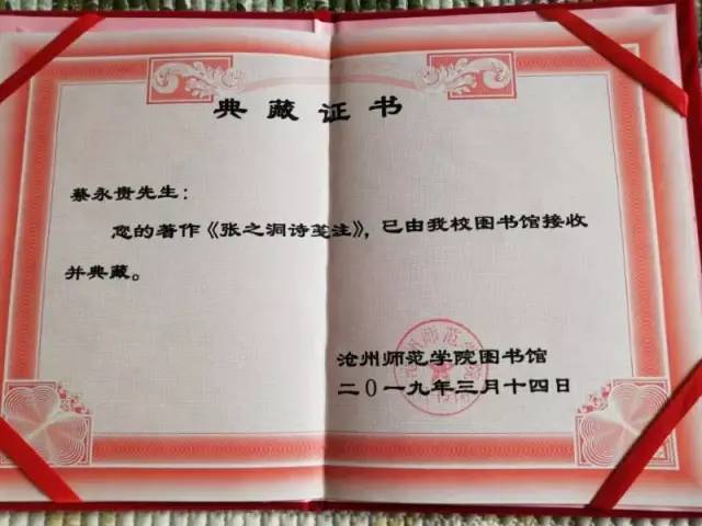 2008年,上海古籍出版社出版了《张之洞诗文集》。蔡永贵开始研读乡贤张之洞的《广雅堂诗集》,研读过程中他越发感觉到张之洞的诗学问深厚,风骨高秀;古典今事,错综为用;咏史纪事,寓意寓志;咏人咏物,兴寄象外。更有点铁成金、脱胎换骨笔法,叙事、咏史、明理、咏物、忧思、明志、讽喻、用典可谓晚清诗坛大手笔。非一般人能读耳。于是蔡永贵就购买了很多与张之洞诗作有关的书籍。当他读到晚清官员、诗人陈曾寿《读广雅堂诗随笔》跋中写到:“予湖居萧然,偶读张文襄公诗集,见所感喻,与平日亲聆绪论及见闻所及,有可以印证发明者,辄笔之于册。公为达官数十年,受两宫知遇,功业灿然于后世,平生少挫折,然所为诗,乃忧深思远,多劳人之辞。癸卯(1903年)入都以后之作,尤沈郁盘纡(苦闷盘结胸中),有惘惘难言之隐。盖公一身始末,关于数十年世运之转移隆替,世变大而虑患深,故多感愤之诗也。则读公诗又其易言哉?公集行世,他日必有任子渊其人者为之笺注,以诏来者,寡陋如予,一知半解。不过为他日采择万一之助,斩春士人之讥,所不辞耳。”时,作为文襄公的乡人,蔡永贵便开始了《广雅堂诗集》注解。十年的努力中,除阅读、翻阅大量张之洞的有关资料和书籍外,蔡永贵还亲自走访了张之洞一生走过的地方,先后沿着文襄公的足迹走访了祖籍南皮、贵阳、贵州安龙、北京、武汉、四川、广州等地,同时并拜访了文襄公的后人张厚粲先生,张厚珕先生,张家粤先生等,2017年并被邀请参加了在贵州安龙举办的“张之洞诞辰180周年研讨会”并在大会上作《晚清独具面貌的诗派领袖》的主题发言。唐代诗人贾岛《剑客》诗:“十年磨一剑,霜刃未曾试。今日把示君,谁有不平事?”蔡永贵用十年的时间完成了《张之洞诗笺注》,并于2018年出版,出版后,他将书分别捐赠给南皮张之洞纪念馆、武汉科技大学图书馆、贵州安龙县志办、武汉张之洞图书馆、beat365在线唯一官网图书馆,并获得南皮文旅局、beat365在线唯一官网图书馆颁发的收藏证书。此外,受沧州国学院邀请在沧州图书馆作《独衔幽愤希高踪》讲座,受沧州国学研究会邀请作《晚清独具面貌的诗派领袖——张之洞》,受沧州文化研究会邀请在风雅颂大讲堂作《不独文章艳少年》系列讲座。