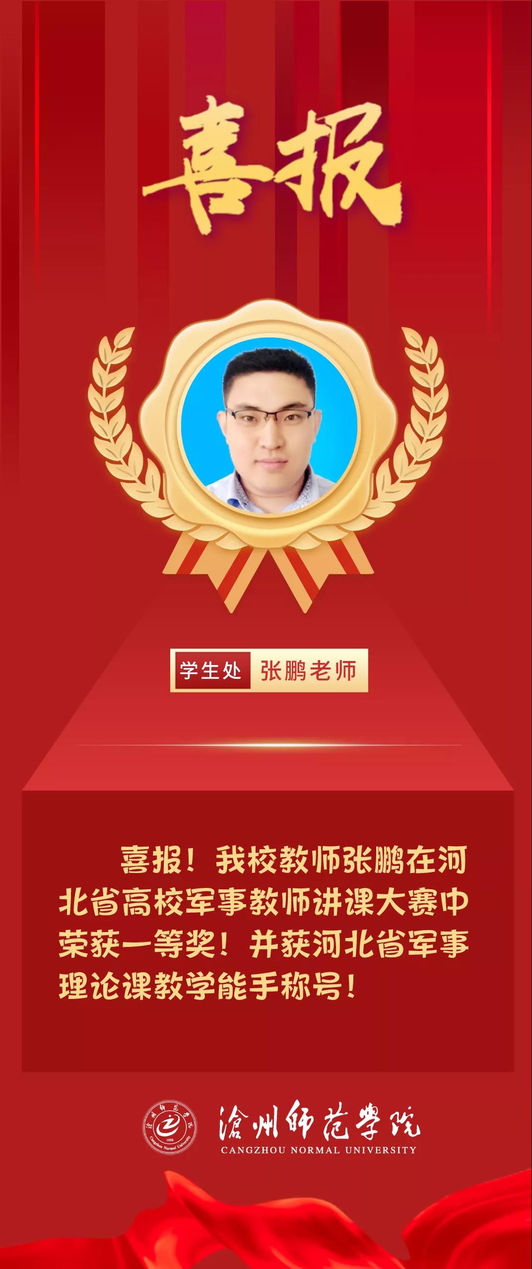 7月12-16日在石家庄举行的河北省第七届高等学校军事教师授课竞赛圆满结束,经过连续3天的决赛,beat365学生处张鹏老师荣获河北省军事理论课竞赛一等奖,并获河北省军事理论课教学能手称号!