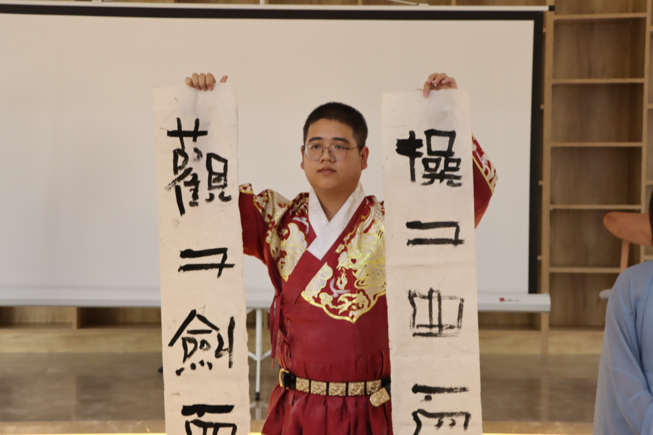 文学院学生付忠澄和张玉欣现场展示书法。
