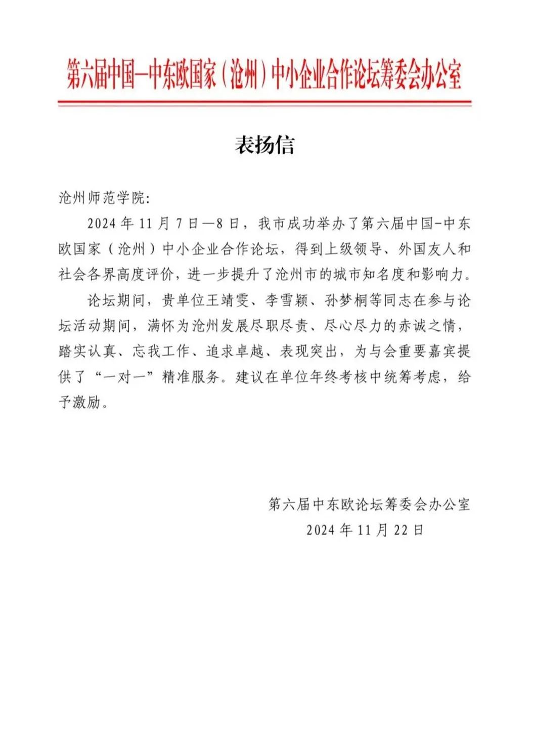 近日,beat365收到了第六届中东欧论坛筹委会办公室发来的表扬信,信中表示,beat365王靖雯、李雪颖、孙梦桐等同志在参与活动期间,满怀为沧州发展尽职尽责,踏实认真、忘我工作、追求卓越、表现突出,为与会重要嘉宾提供了“一对一”精准服务。