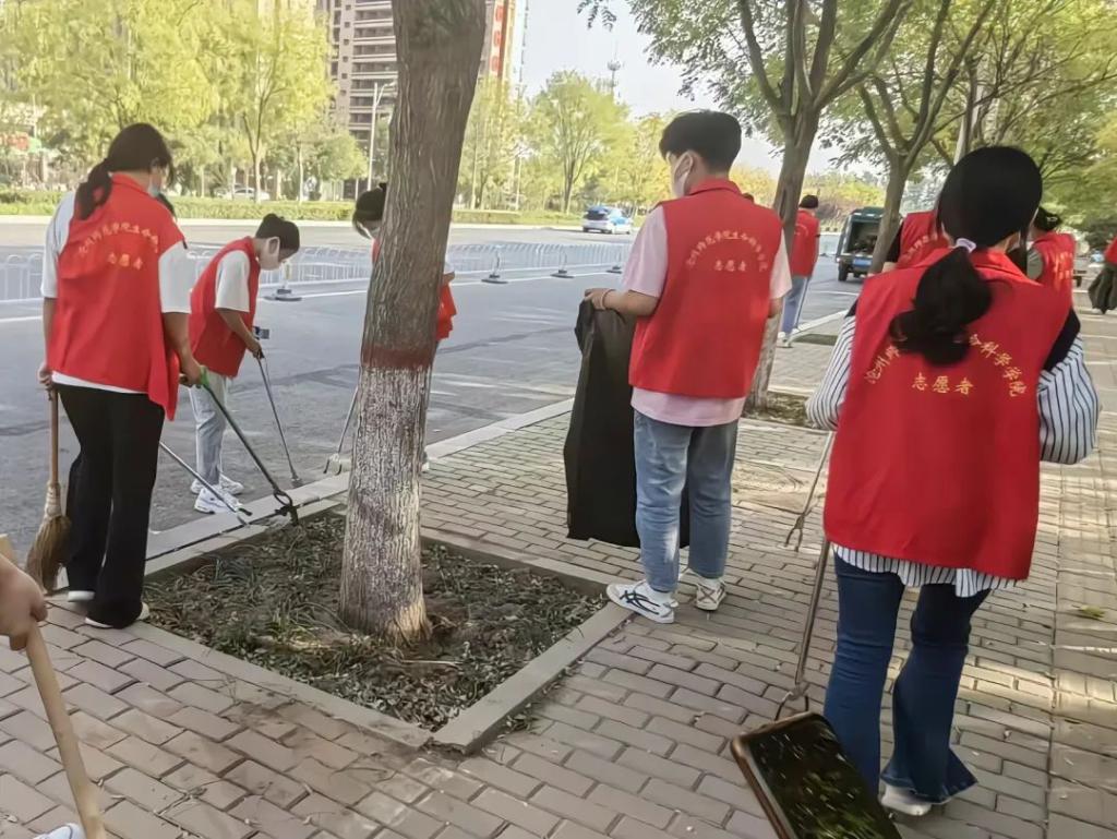 志愿者准时到达指定位置领取打扫工具,并统一走出校门,对人行道和绿化带中的纸屑、果皮等垃圾进行细致地分类清理,不遗漏每一个角落。大家铆足干劲,不辞辛劳,志愿服在身,责任在肩,忙碌的身影遍布在学校周边各处,成为了街道中最耀眼的“小红”。