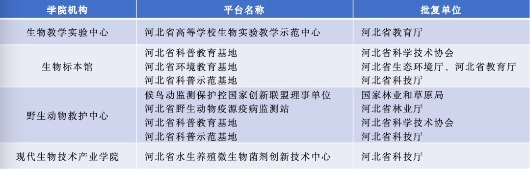 学院平台多元。拥有生物教学实验中心、生物标本馆、野生动物救护中心、现代生物技术产业学院4个省级以上教学科研平台和1个多功能温室大棚。