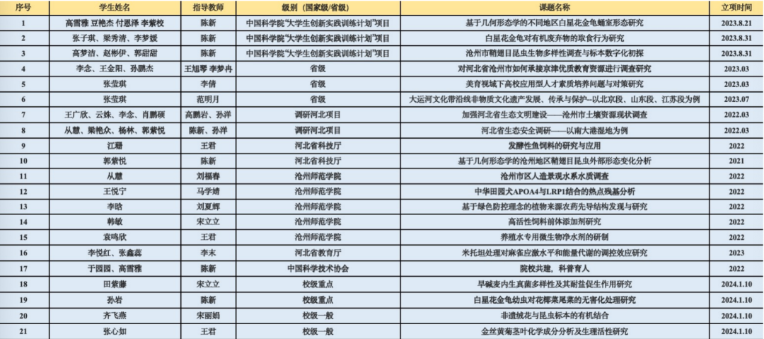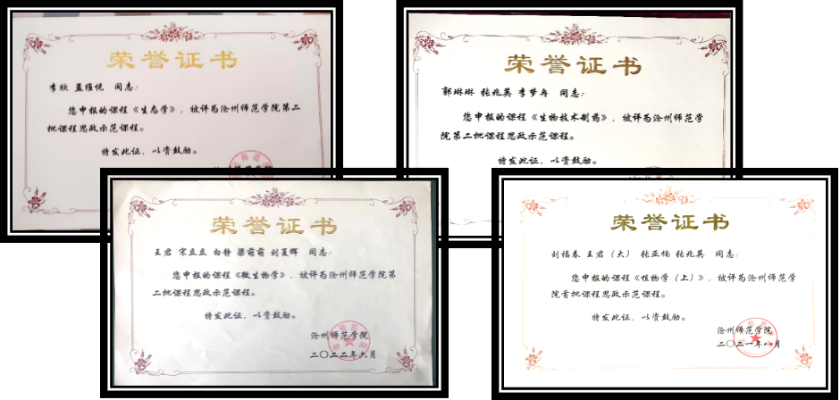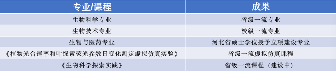学院成果丰硕。拥有省级一流专业1个(生物科学专业)、校级一流专业1个(生物技术专业)、河北省硕士学位授予立项建设专业1个(生物与医药专业)、省级一流虚拟仿真课程1门(《植物光合速率和叶绿素荧光参数日变化测定虚拟仿真实验》)、省级一流课程1个(《生物科学探索实践》,建设中)。