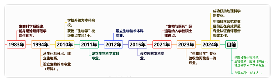 生命科学学院前身为沧州师范专科学校化学系生物教研室,1994年从化学系分出,建立生物系,2010年更名为生命科学系,2015年定名为生命科学学院。现有生物科学、生物技术、园林(停招)、地理科学4个本科专业,本科生884人。