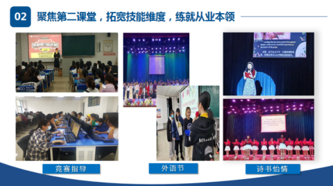 社团活动与专业赛事协同开展,职业道德、语言知识、思维品质、专业技能有效衔接。外语节坚持“从课堂中来,到生活中去”,让学生在活动中陶冶情操,增长知识,用语言联通世界,用智慧创造未来。“诗书怡情”让学生读经典,赏文化,拓视野,厚底蕴,以书香伴随个人成长,以心灵感悟生活真谛,以知识营造校园文化。“七一勋章”紧扣“红心向党,致敬英雄”主题,以英文话剧讲好红色故事,立鸿鹄志,抒爱国情。名师讲堂彰显一线名师风采,呈现经典教学案例,传播先进育人理念,传授实用教学方法,构架起理论学习与实践教学的桥梁。
