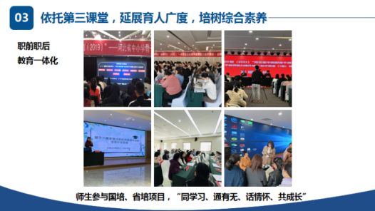职前职后教育一体化:承办“国培”、“省培”项目,让学生有机会与专家学者、一线名师、骨干教师“同学习、通有无、话情怀、共成长”。国际交流志愿服务专业化:师生在国际活动中发挥特长,贡献力量,展现风采。基础教育志愿服务常规化:每年师范生赴偏远地区支教,以个人“星星之火”,助力脱贫攻坚、教育先行的燎原之势。社会志愿服务常态化:学生积极投身社区志愿服务,将专业技能与真情实感融入社会实践,温暖人间。